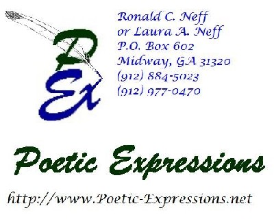 Original Gift Poetry - Cards, Framed, Bookmarks and Magnets - Made to your order. Poetic Expressions is proud to present the first two poetry e-books in it's collection. They are Poetic Expressions Volumes I and II. The cover art and the photography have been created and worked by Ronald C. Neff, the poetry is all written by Rev. Laura A. Neff. Portions of all proceeds go toward WolfPoet Ministries. Not only will you find e-books but we also customize our poetry for any occasion and any customer, framed and delivered, email download, and even on bookmarks and magnets. Coming soon we'll have testimonials from those who have requested or received pieces from Poetic Expressions. Find us on the web at these locations. Ronald C. and Rev. Laura A. Neff Co-Owners Poetic Expressions http://www.poetic-expressions.net